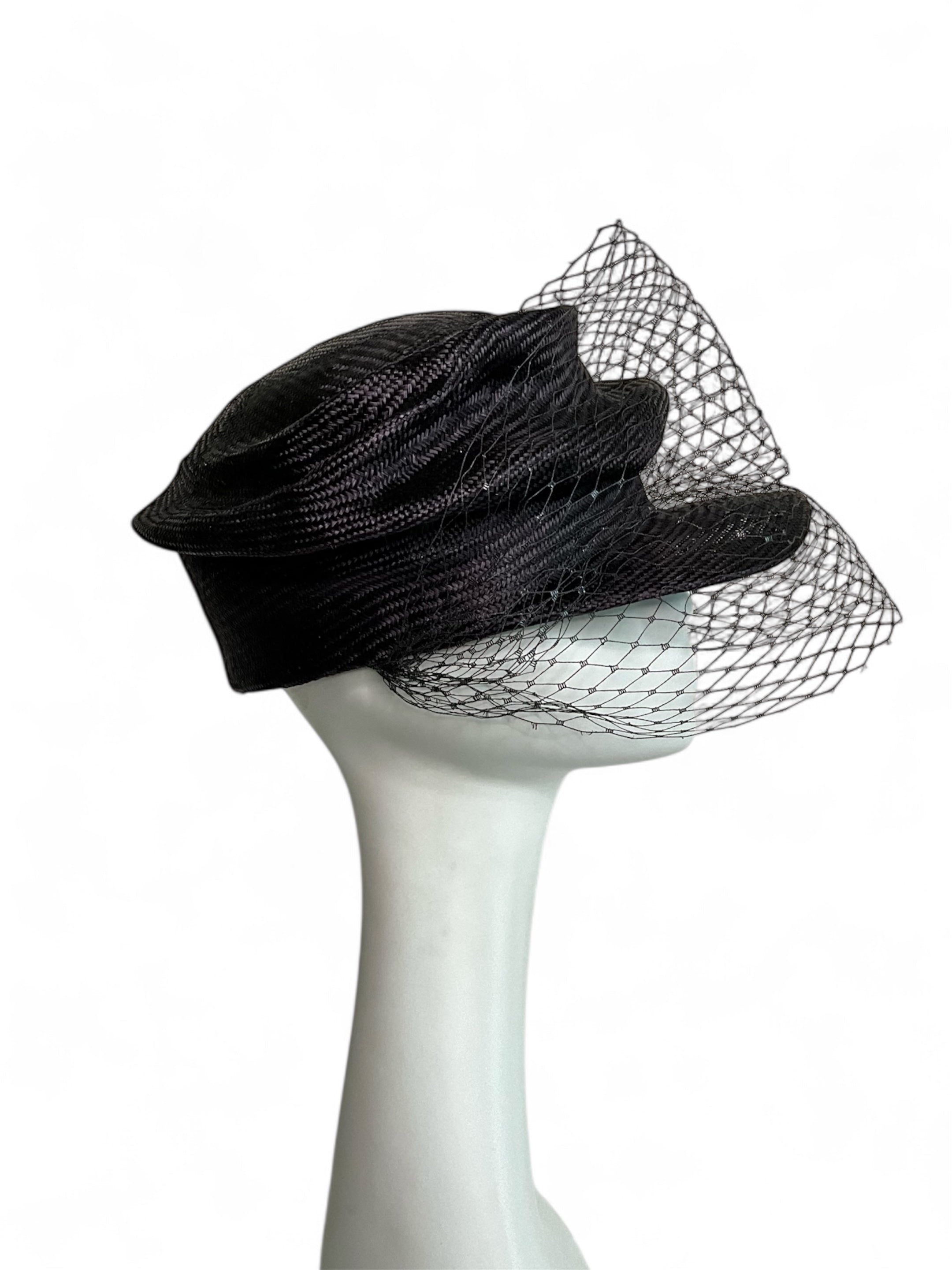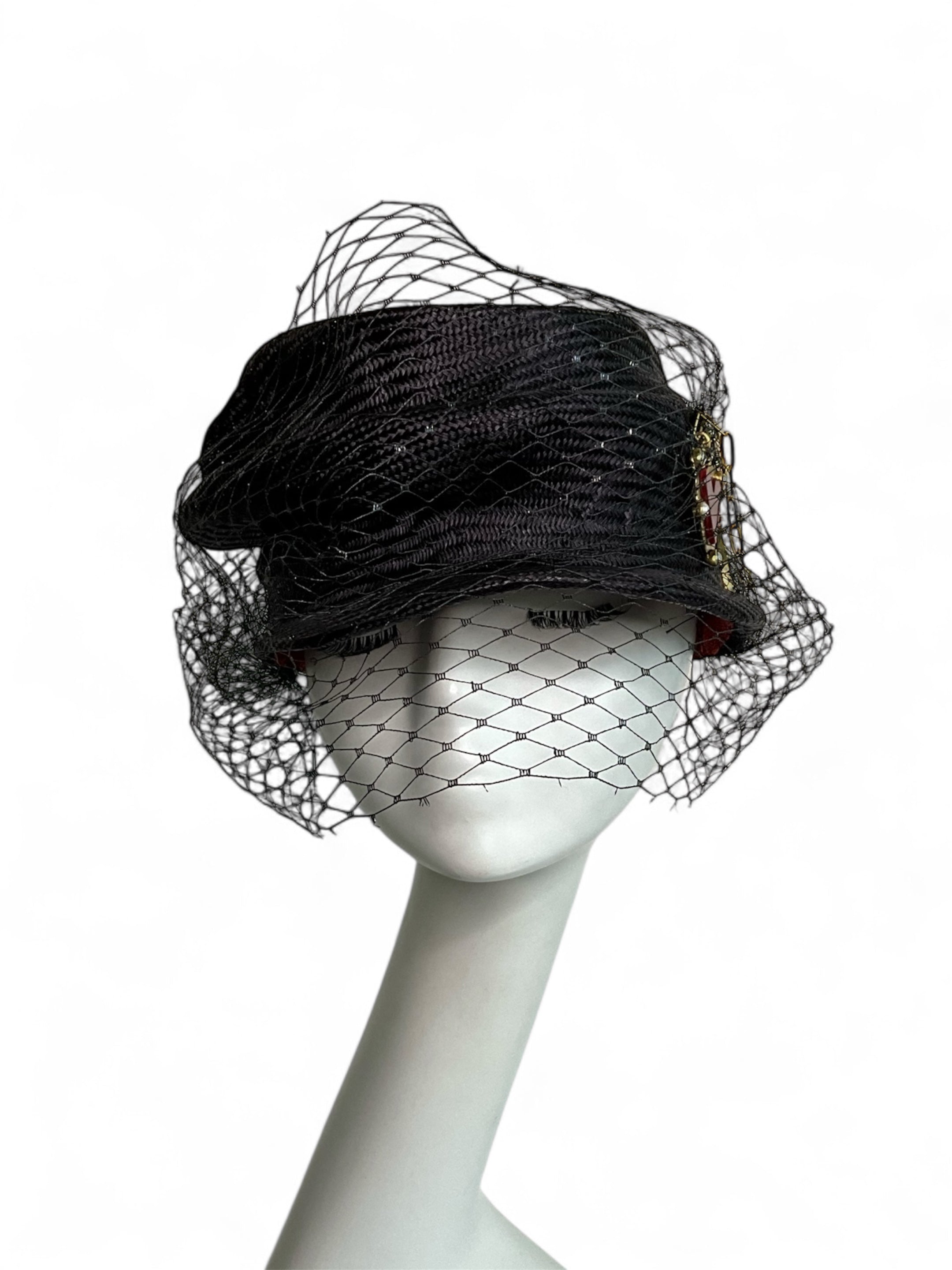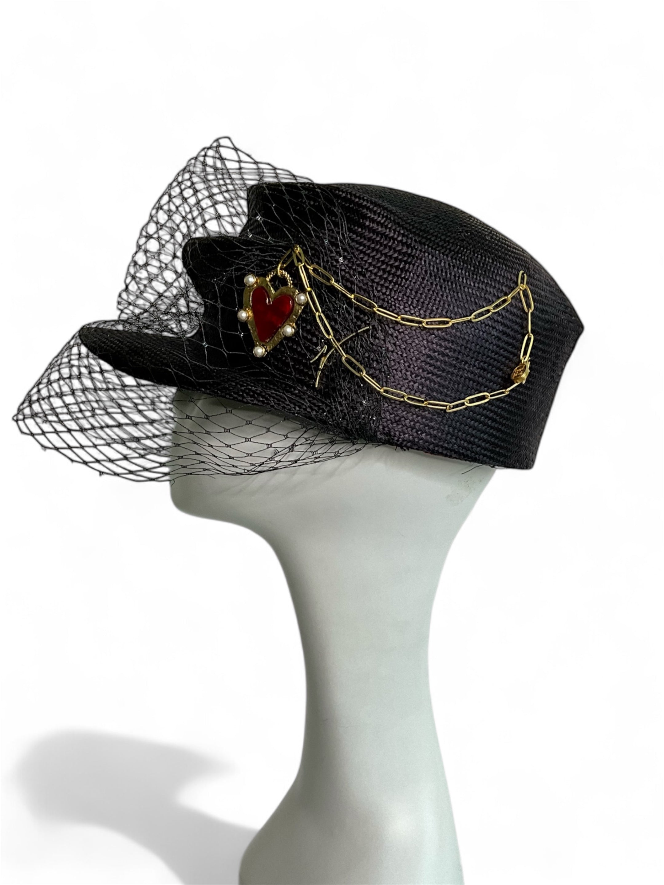 Este sombrero combina la estructura de un visor negro con un velo que oculta y revela al mismo tiempo. El corazón rojo, encadenado en oro, simboliza la pasión que arde en silencio — esa que no se dice, pero se siente.