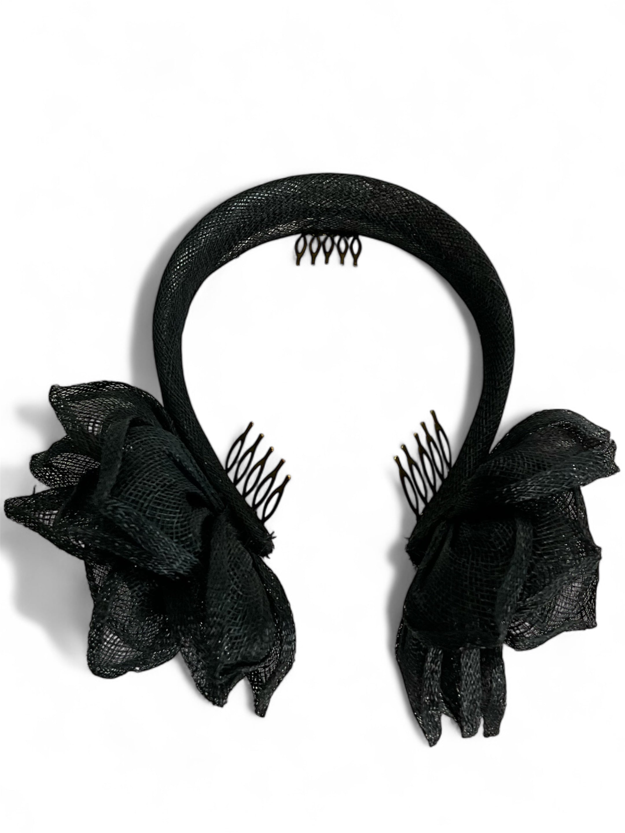 •A sculptural headband crafted in black sinamay, adorned with delicate yet defiant roses.