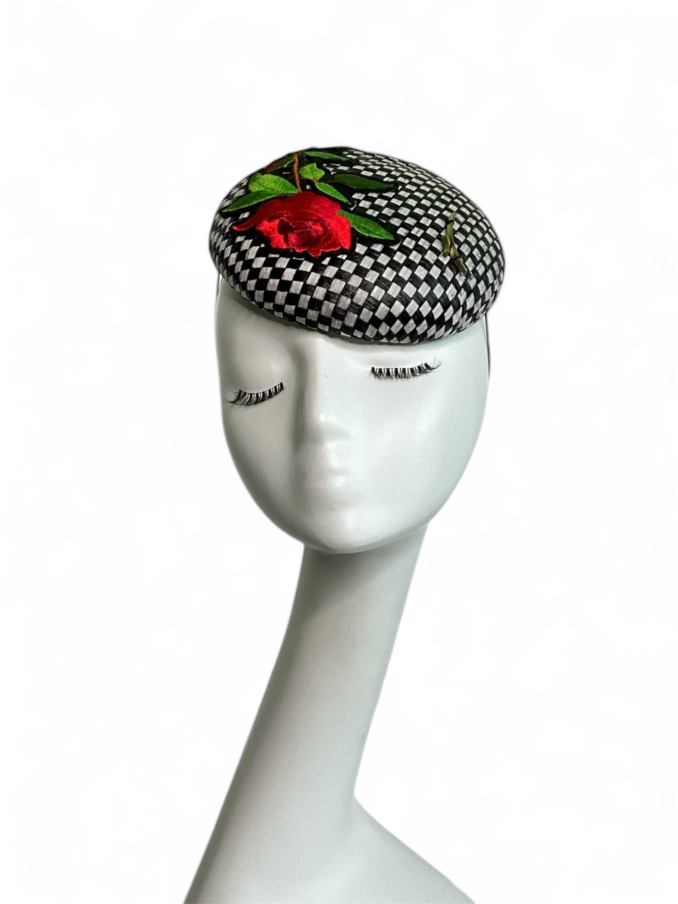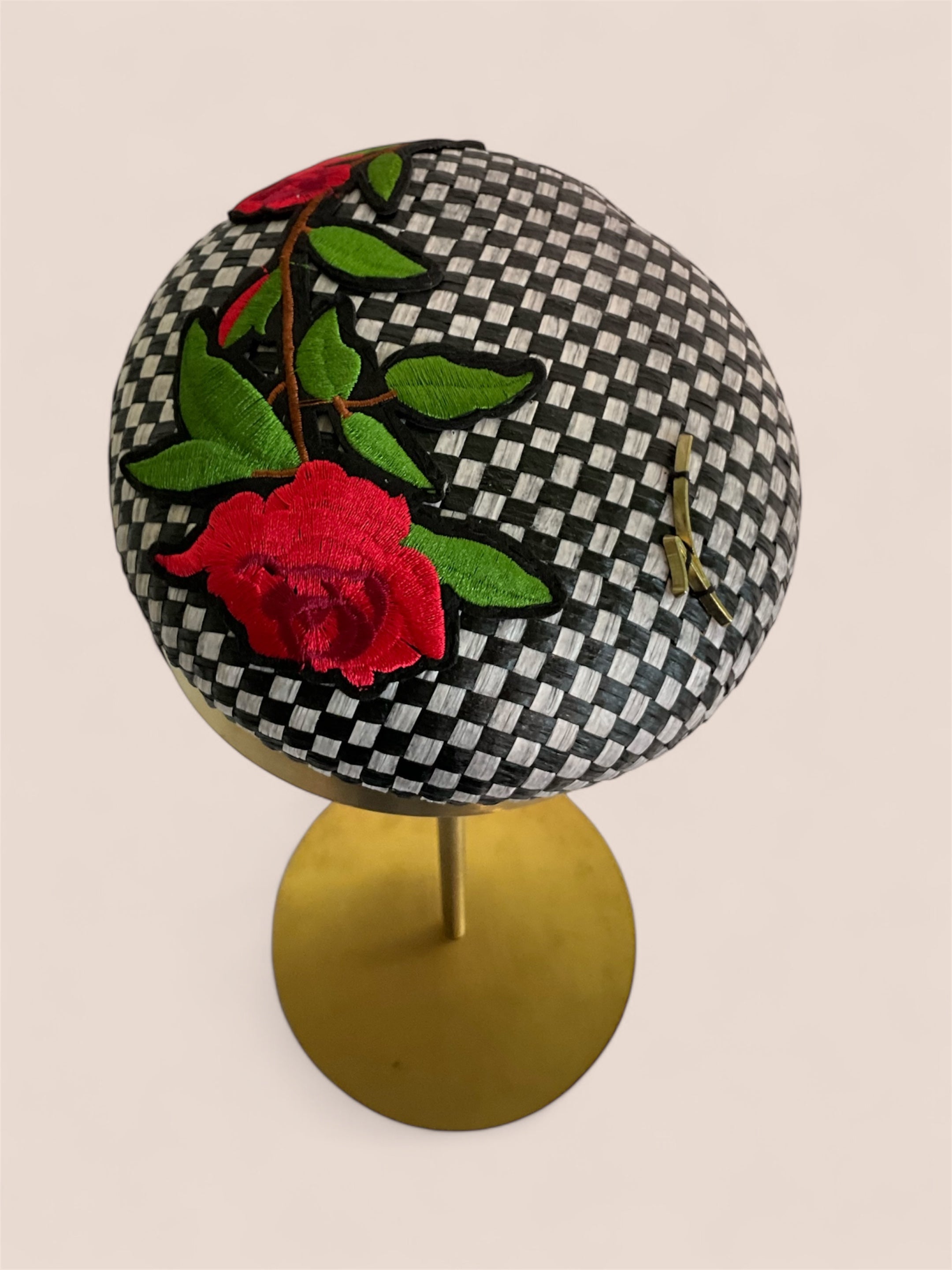 •Handcrafted with a woven black-and-white base and an embroidered red rose that doesn’t play by the rules.