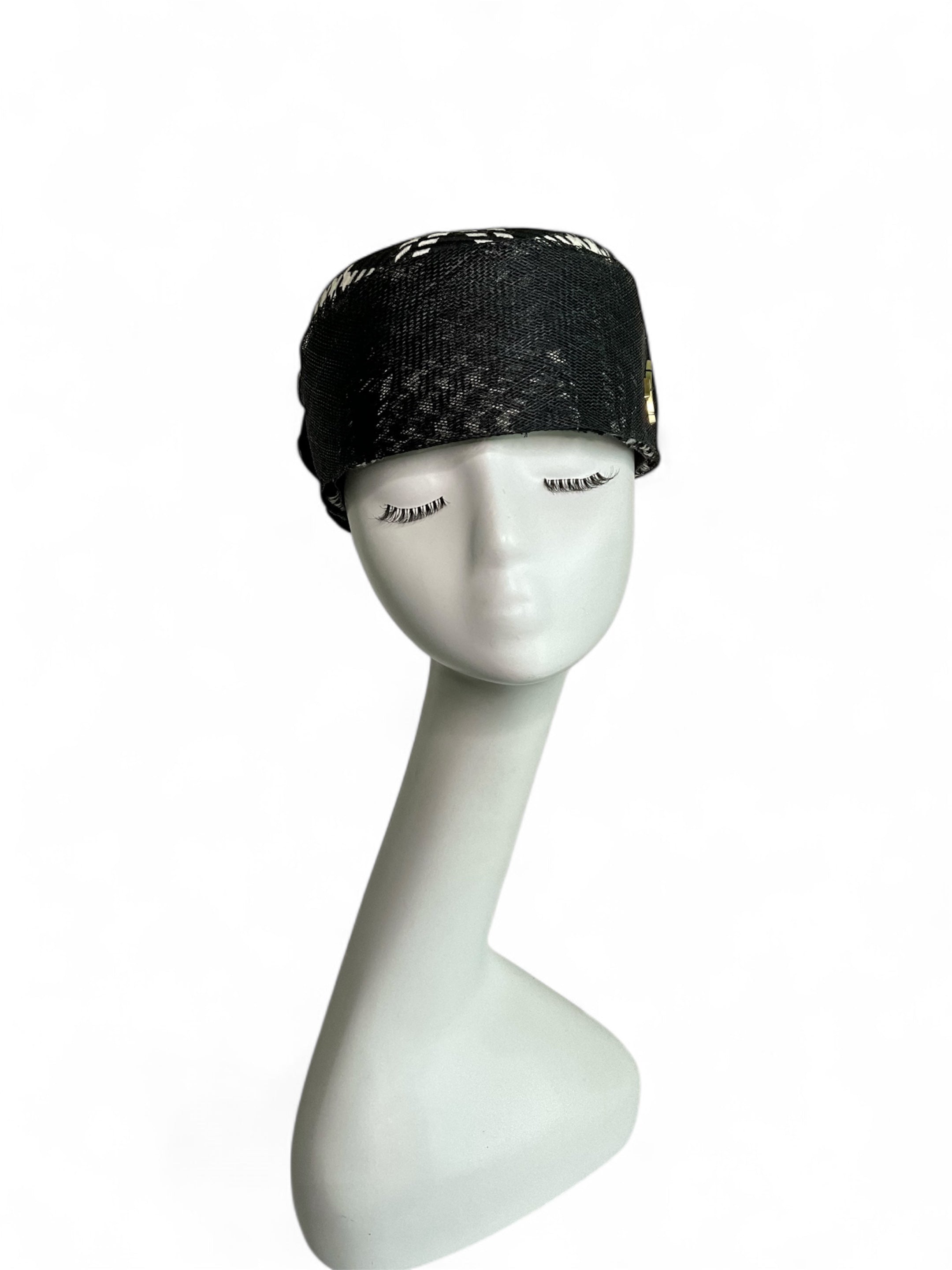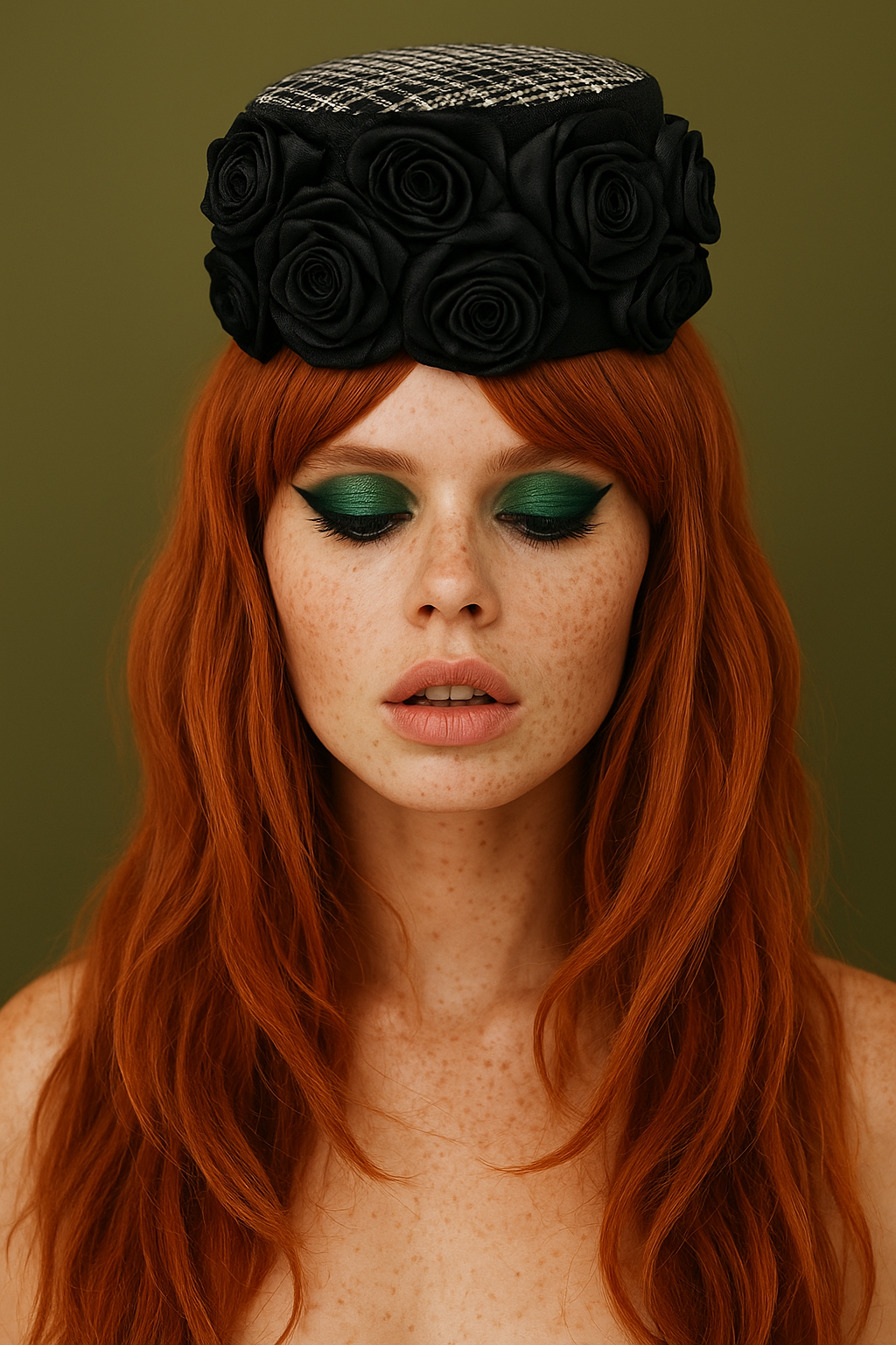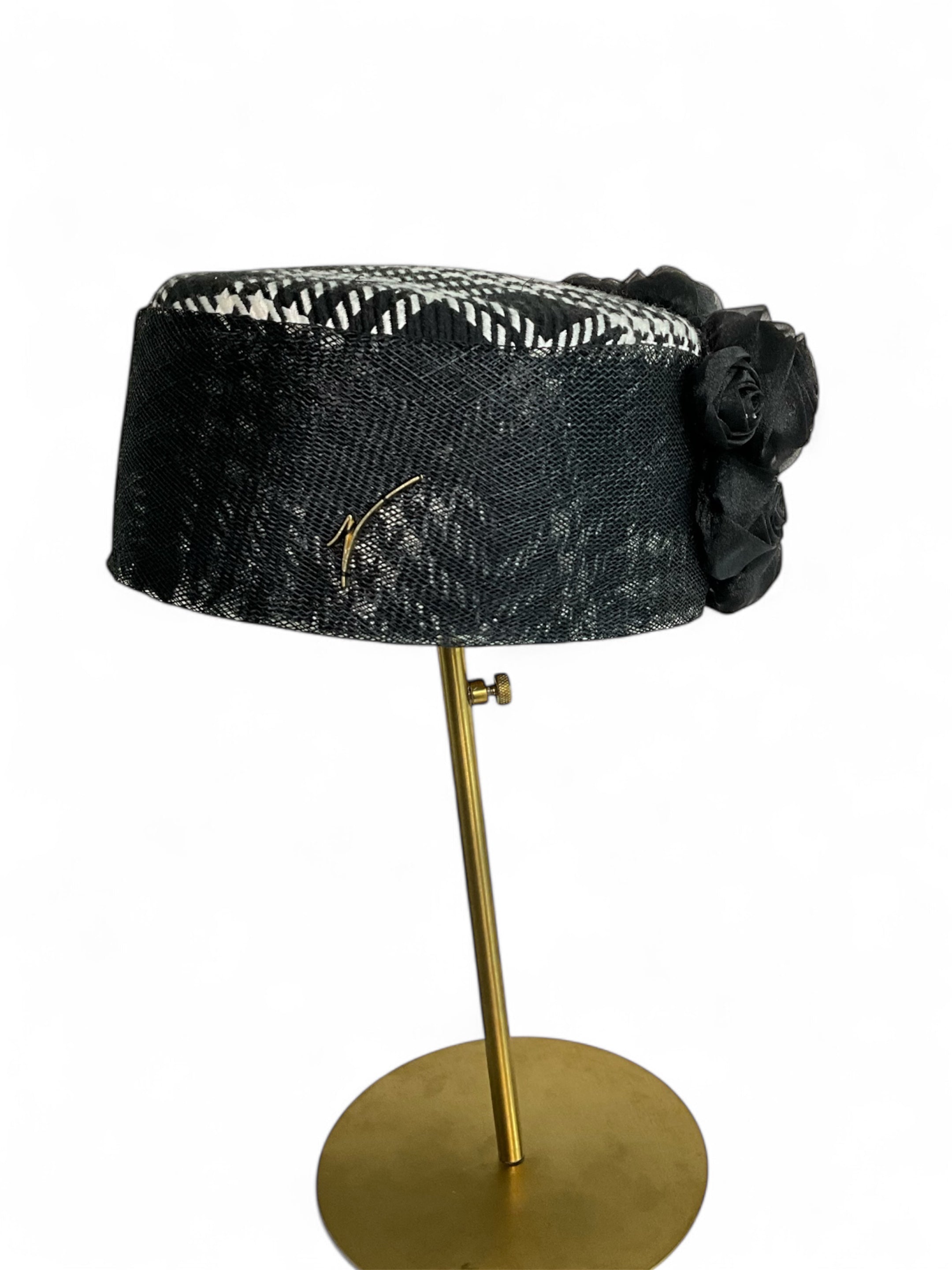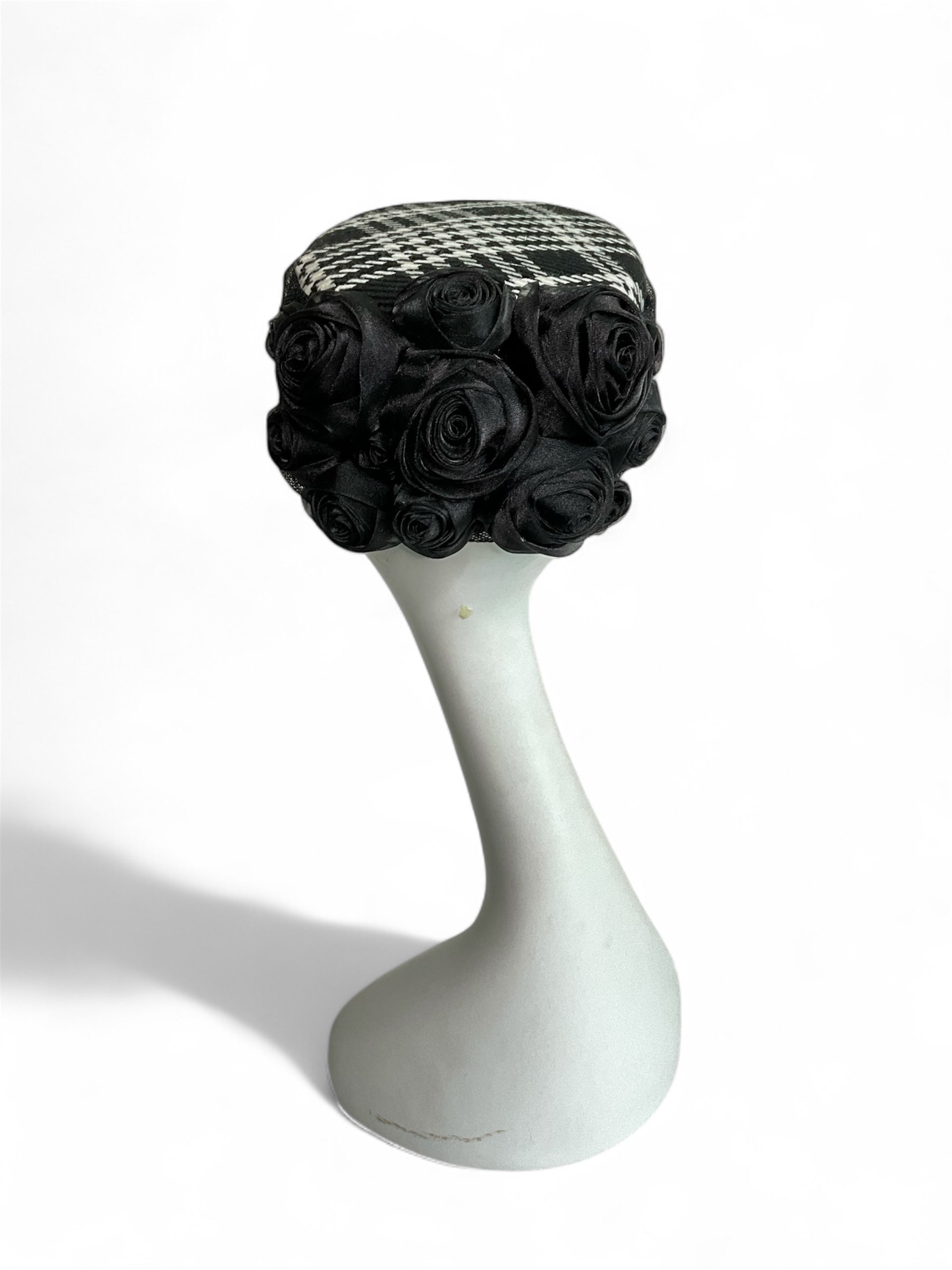 •A statement pillbox hat handcrafted in houndstooth fabric and black sinamay, crowned with black roses —the kind that whisper sophistication with a hint of rebellion.